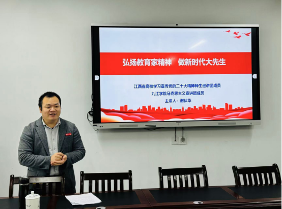 为深入学习贯彻习近平总书记关于教育的重要论述,大力弘扬教育家精神,进一步提升学院师德师风建设水平。11月20日,马克思主义学院副院长谢伏华博士为万象城官网教职工开展了一场以“弘扬教育家精神, 做新时代大先生”为主题的师德师风宣讲活动,此次活动由院党委书记王英姿主持。