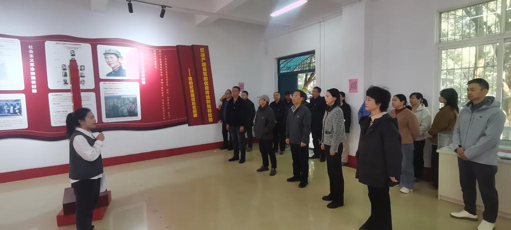 学校廉洁文化教育基地分为党的纪律建设历程、十八大以来全面从严治党成就、十九大以来全面从严治党工作、廉洁文化警示区、红色文化传播区、党员宣誓区六大展区,展厅以“廉洁守正 立德树人”为核心主题,采用图片、实物、案例等形式呈现党的纪律建设历史和典型案例。在基地讲解员的引导下,全体人员依次参观了基地各个展厅。在党员宣誓区,全体党员庄严举起右手,重温了入党誓词。